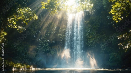 waterfall, dense, forest, sunlight, filtering, through, tree, illuminating, water, nature, tree, sun, light, landscape, morning, fog, mist, autumn, park, road, green, wood, wood, ray, sunrise, foliage, summer, misty, beautiful, path, ray