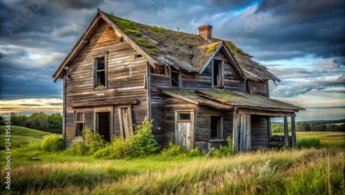 abandoned, dilapidated, derelict, farmhouse, rural, overgrown, weathered, old, rustic, decay, moss, grass, house, structure, home, countryside, landscape, scenery, field, sky, cloud, sunset