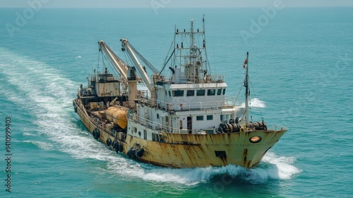 A weathered fishing vessel sails through the ocean waters today