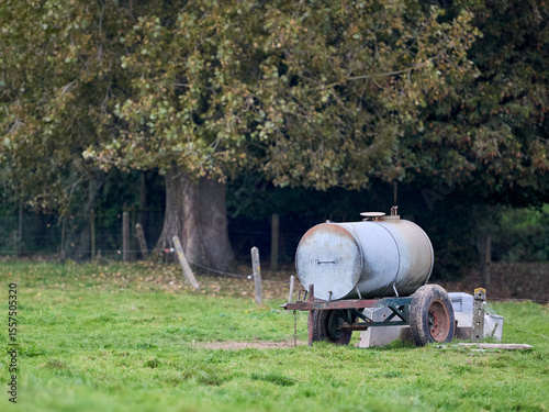 agriculture, farm, field, pasture, countryside, rural, water, trough, tank, farm animal, equipment, mobile, weathered, old, metal, grass, green, tree, nature