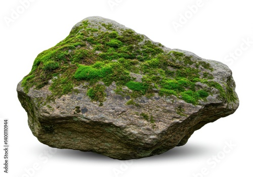 A weathered rock covered in vibrant green moss against a plain white background in studio shot