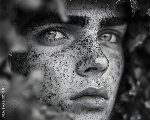 soldier, face, memorial, remembrance, death, eye, portrait, black-and-white, monochrome, war, chaplet, solemn, serious, contemplative, rugged, textured, weathered, masculine, gritty, intensity, expression, emotion, sacrifice, duty, honour, grief, loss, history, bequest, service, courage, struggle, survival, conflict, perseverance, dedication, patriotism, nationality, identity, humanity, strength, endurance, shadow, contrast, light, depth