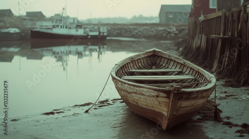 boat, wooden, shore, misty, tranquil, serene, weathered, morning, foggy, harbor, calm, ocean, rustic, vintage, peaceful, nature, landscape, maritime, dock, coastal, idylli, dinghy, water, quiet, untouched, solitude, moored, fishing, early morning, docked, retreat, scene, nautical, shoreline, horizon, sea, waterscape, environment, tranquil scene, mist, boating, escape