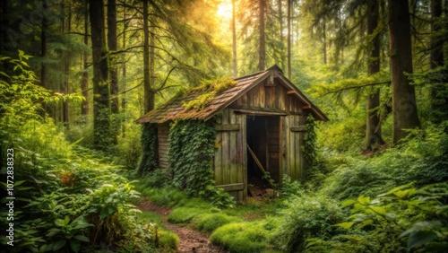 A weathered wooden shack nestled within a verdant forest, bathed in the golden glow of a sunlit clearing.