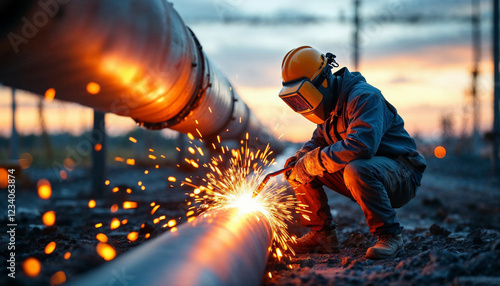 welder, welding, spark, pipeline, gas, safety, mask, gear, torch, fire, heat, industry, construction, engineering, metal, men at work, protection, expertise, labor, energy, infrastructure, craftsmanship, flames, bright, precision, power, industrial, steel, outdoors, equipment, skill, glove, sunlight, sunset, glow, molten, sharpened, hazard, strength, dedication, fabrication, durability, tool, craftsmanship, heavy, work, factory