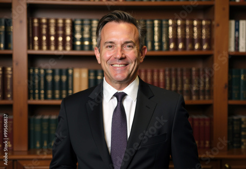 A well-groomed man wearing a dark suit and tie stands with a friendly smile in an elegant library lined with bookshelves, conveying a sense of professionalism and warmth - Generative AI
