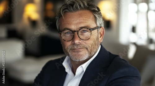 A well-groomed middle-aged man in glasses is seated in a stylish lounge. He has a calm expression, exuding confidence and thoughtfulness in the bright, sophisticated setting