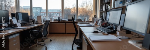 A well-lit modern office space with large windows, filled with desks, computers, and office chairs.
