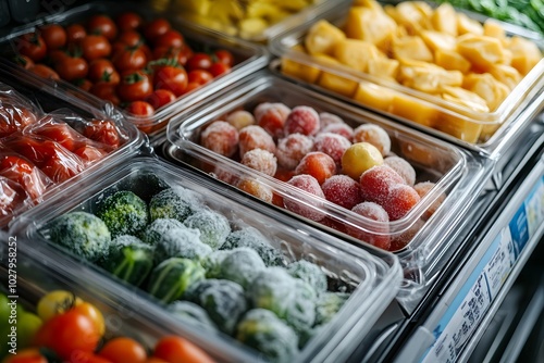 A well-organized frozen foods section with a variety of frozen fruits, vegetables, and ready-to-eat meals