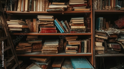 photo, color image, no people, book, bookshelf, indoor, shelf, library, horizontal, vertical, old, education, literature, antique, in a row, old-fashioned, closeup, stack, collection, learning, wisdom, furniture, reading, research, university, home interior, still life, bookshop, studying, history, studio shot, archival, datum, imagination, page, britain, book cover, paper, vase, avocation, old book, pattern, ancient, document