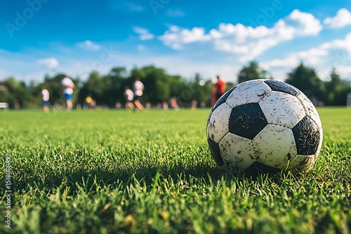 A well-used soccer ball sits on a lush green field, players blurred in the background