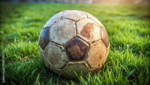 A well-worn soccer ball rests peacefully in the vibrant green grass, showing the marks of countless games and the passage of time