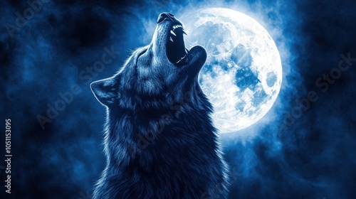A werewolf howling at a glowing full moon, with fog swirling around in a spooky forest.