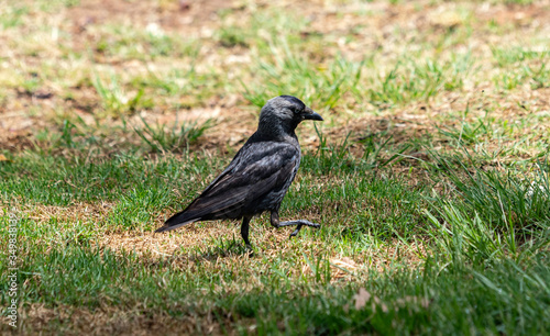A western jackdaw (Coloeus monedula) foraging for food on a grassy field