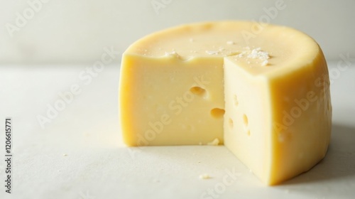 A wheel of pale yellow cheese, cut into sections, reveals a creamy interior with small holes, resting on a bright surface.