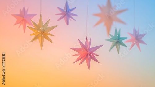 A whimsical arrangement of multicolored paper flakes shaped like stars and circles, suspended in mid-air against a gradient sunset background