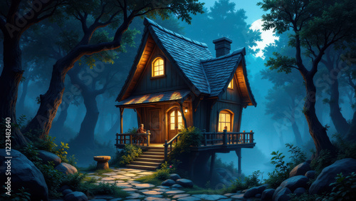 bungalow, fairy tale, nature, fantasy, magic, forest, house, enchanting, path, tree, wooden, cosy, night time, home, charming, serene, tranquil, dreamy, rustic, idylli, twilight, storybook, stone, pathway
