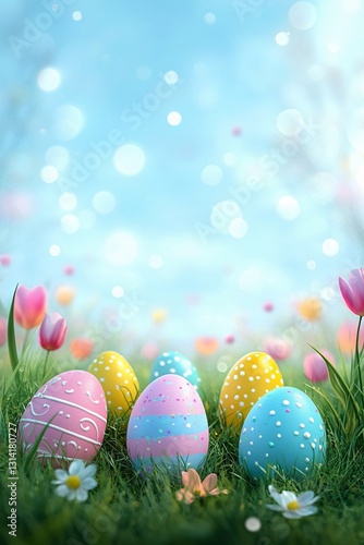 A whimsical Easter scene featuring pastel-colored eggs and tulips on a vibrant grassy field, perfect for spring festivities, greetings, and decorations.