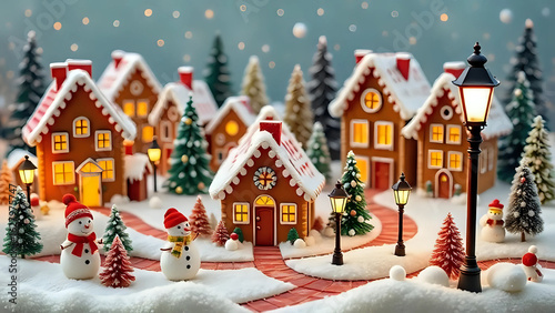 A whimsical gingerbread village scene with snowcovered houses, christmas trees, and snowmen, creating a festive holiday atmosphere with warm lighting