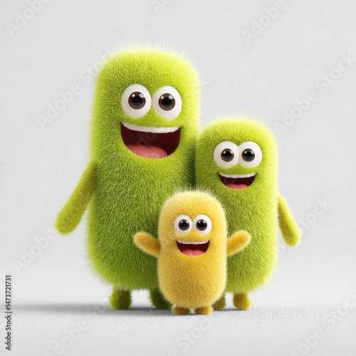 A whimsical playful of a cartoon family of three fluffy colorful green creatures with expressive smiling faces and endearing childlike features