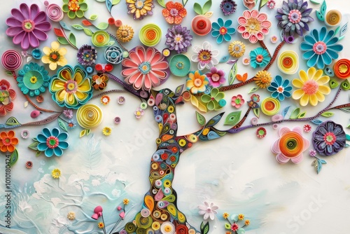 A whimsical tree with colorful flowers, each flower made of round pieces of paper quilling in various colors and sizes