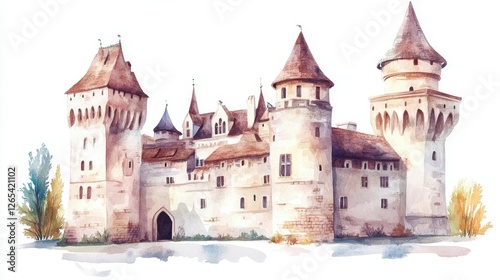 A whimsical watercolor painting of a fairytale castle with turrets and a charming landscape surrounding it.