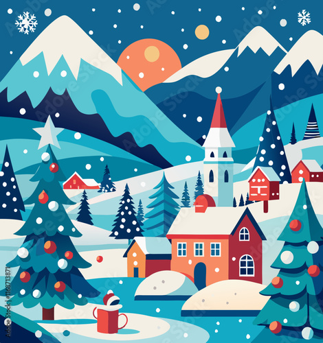 christmas, winter, snow, house, tree, holiday, vector, landscape, illustration, season, christmas, village, cartoon, snowflake, card, celebration, decoration, star, scene, new year, night, cold, nature, forest, town