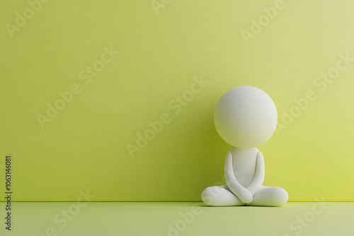 A white abstract figure sits cross-legged against a light green wall on a minimalist green floor exuding calm and simplicity