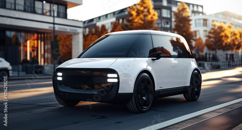 A white and black compact electric vehicle with minimalistic features including LED headlights on the front window.
