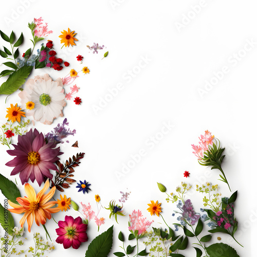 a white background topped with lots of flowers, blank space made with Generative AI technology