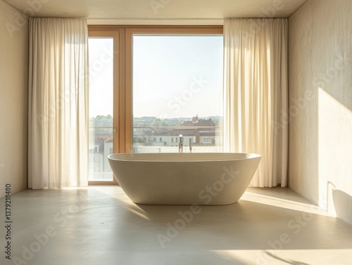 white, bathtub, bathroom, curtain, open, sunlight, tub, modern, house, interior, luxury, design, apartment, nobody, home, room, bathe, render, decor, window, contemporary, floor, architecture, faucet, inside, clean, three-dimensional, empty, ceramic, style, elegance, new, illustration, light, estate, wall, domestic, hotel, concrete, furniture, indoor, sink, hygiene, bright, laundered, porcelain, freestanding, property