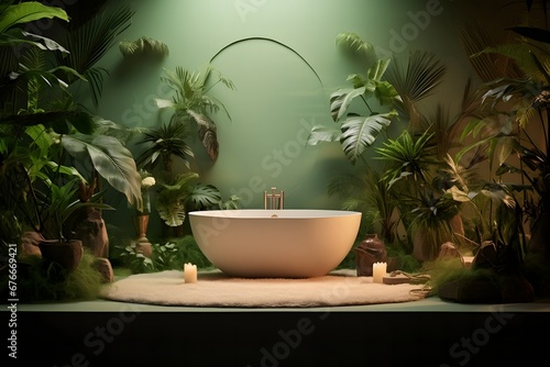 a white bathtub is sitting behind a green wall, in the style of luminous 3d objects, lively tableaus, carl kleiner, tropical landscapes, high quality photo, light emerald and dark beige, nature-inspir