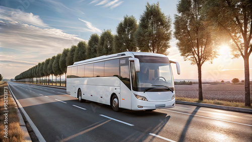 A white bus drives along a picturesque highway bordered by rows of trees under a clear blue sky in the warmth of the afternoon sun, showcasing a tranquil landscape