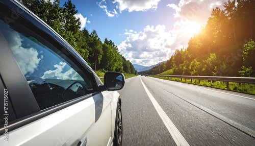 A white car drives along a highway, surrounded by lush green trees and a bright, sunny sky.