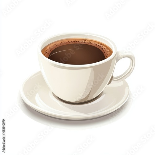 A white ceramic cup filled with hot coffee sits on a matching saucer. The coffee has a rich, dark color with a light layer of froth on top, suggesting it is freshly brewed and inviting.