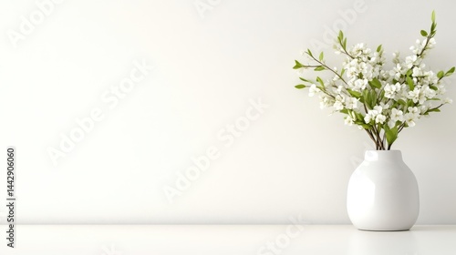 A white ceramic vase with delicate white flowers on a minimalist white shelf, simple and elegant interior design, and bright and clean composition.