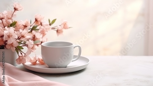 A white coffee cup and saucer sit on a white table next to a bouquet of pink flowers with a soft, blurred background.