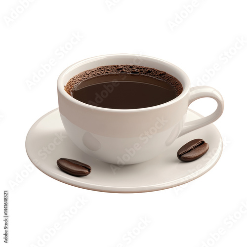 A white coffee cup filled with dark coffee, accented with coffee beans.