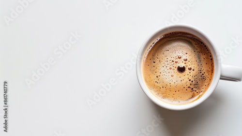 A white coffee cup with a brown foam on top. The foam is bubbly and looks like it's been stirred