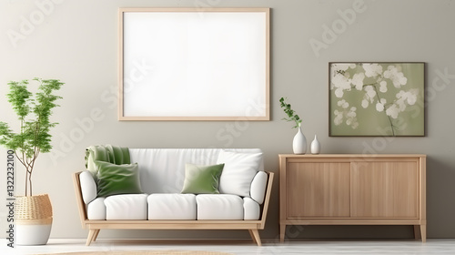 white, couch, green, pillow, sit, front, wall, frame, room, interior, sofa, vase, design, flower, table, picture, modern, poster, background, floor, style, furniture, living, home, scandinavian, blank, empty, canvas, up, wooden, mock, template, light, art, decor, space, house, nobody, apartment, image, contemporary, concept, architecture, illustration, painting, comfortable