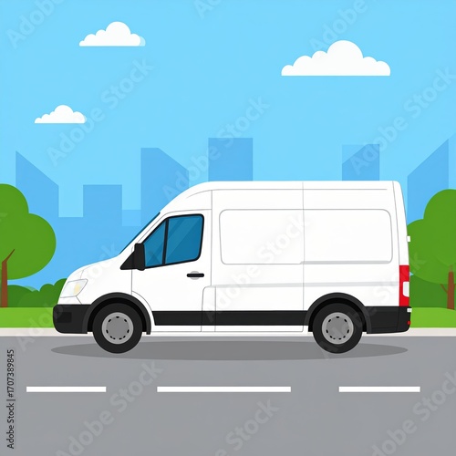 van, vehicle, transportation, delivery, cargo, shipping, road, street, asphalt, travel, drive, moving, urban, city, skyline, building, background, tree, green, nature, sky, cloud, blue, white, design, illustration, flat, style, modern, graphic, commercial, service, business, package, logistic, transport, automobile, transit, courier, good, distribution, mail, parcel, express, fast, speed, journey