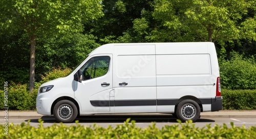 A white delivery van parked on a street with lush green trees and bushes in the background. Commercial transport for cargo.