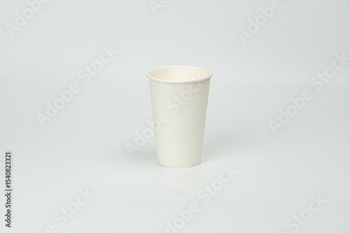 A white disposable cup with lid sits on an even surface against a light gray background, casting a subtle shadow The cup design has a sipping opening and is photographed from above in soft lighting