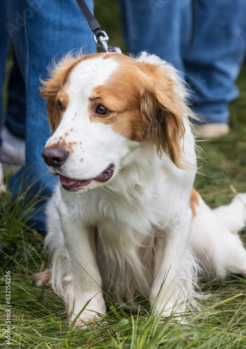 white, dog, red, spot, sitting, leg, owner, friends, wool, fluffy, blue, day, summer, walk