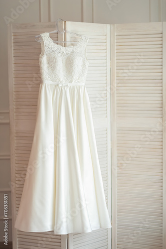 A white dress hangs delicately on a white door, exuding ethereal beauty and capturing the essence of pure aesthetics.