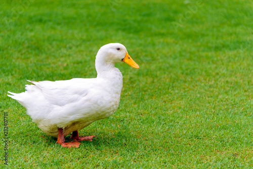 A white duck stand on the grass field.