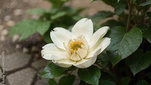 A white flower blooms with yellow center surrounded by green leaves near a gray stone path