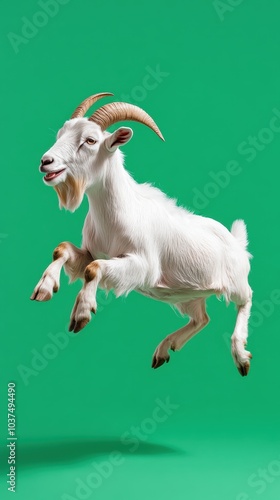 A white goat leaps playfully against a vibrant green background, showcasing its agility and energetic spirit.