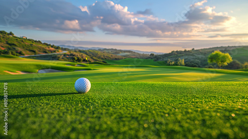 A white golf ball sits on the green grass of a golf course