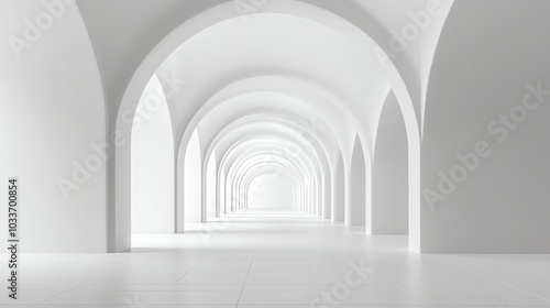 A white hallway with many arches leading to a bright light at the end.